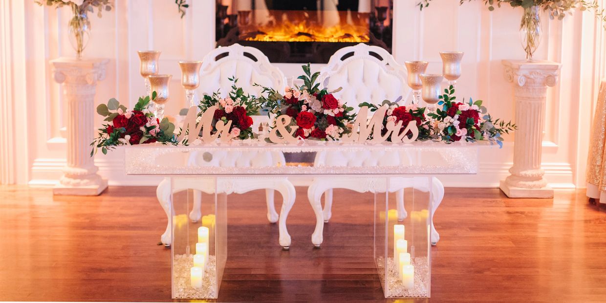This is a beautiful, acrylic glass table with led candles located in its base. In the table and base you'll have acrylic, diamond shaped, crystals. You can rent the table with or without chairs.