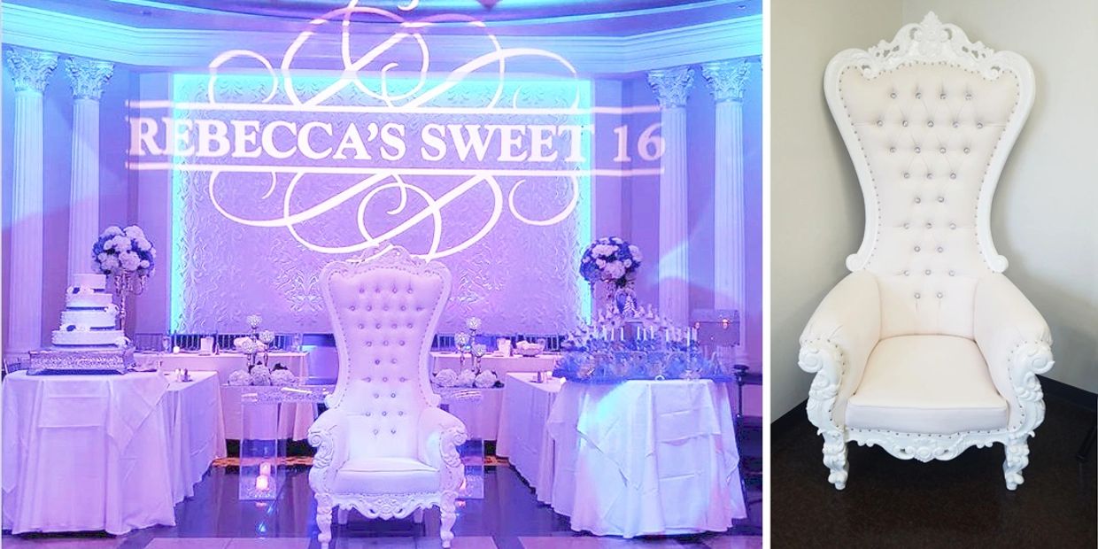 Its your day, why not feel like it. These beautiful chairs can be rented for a Bride & Groom or Sweet 16.